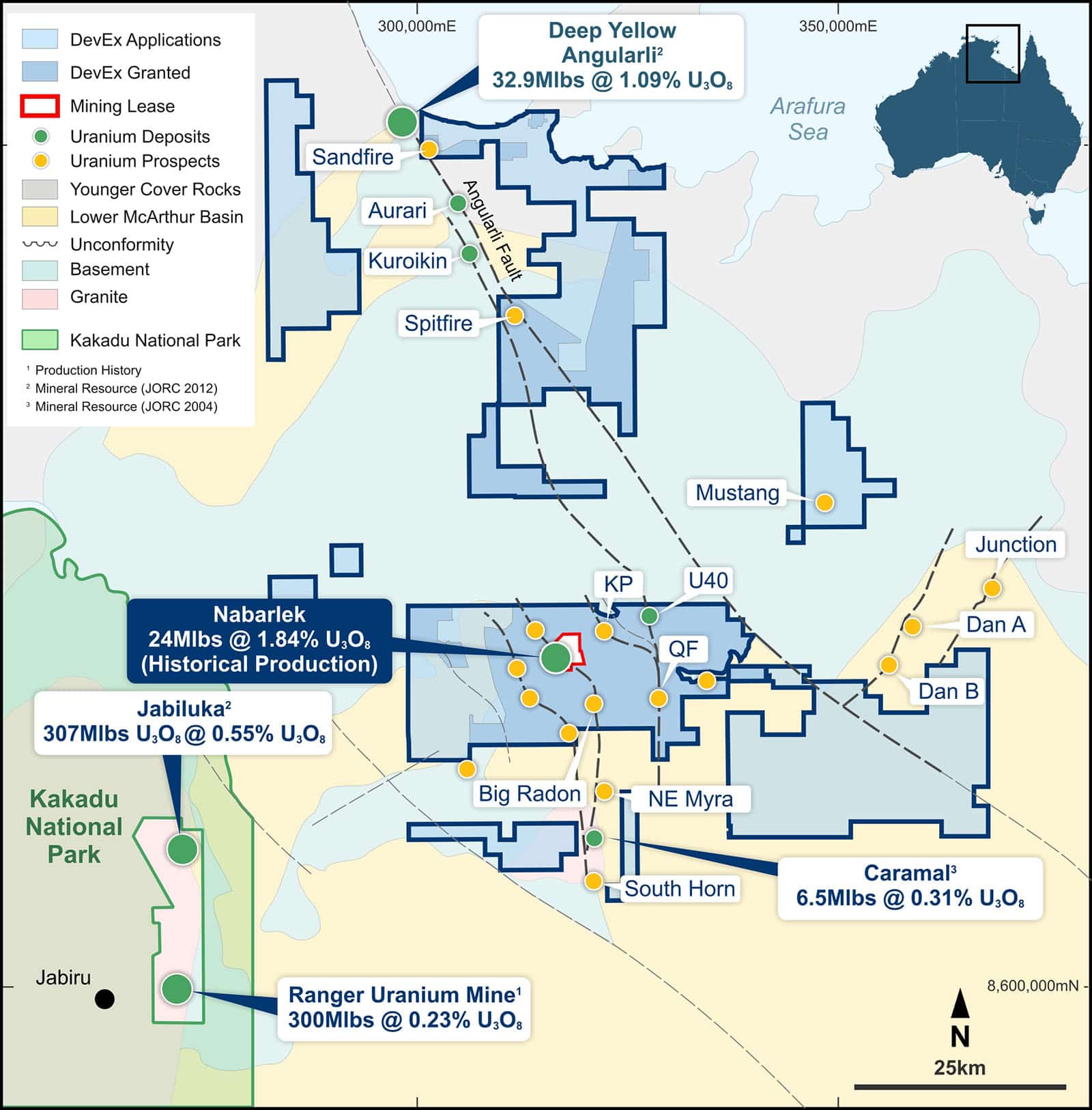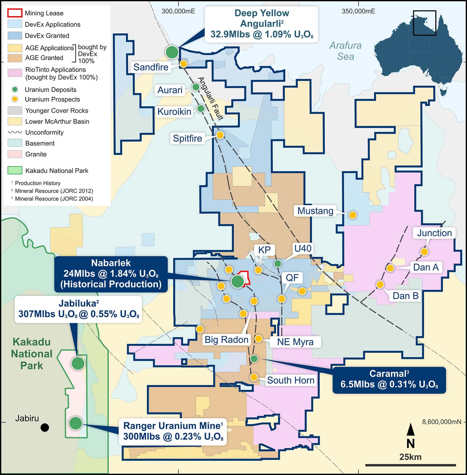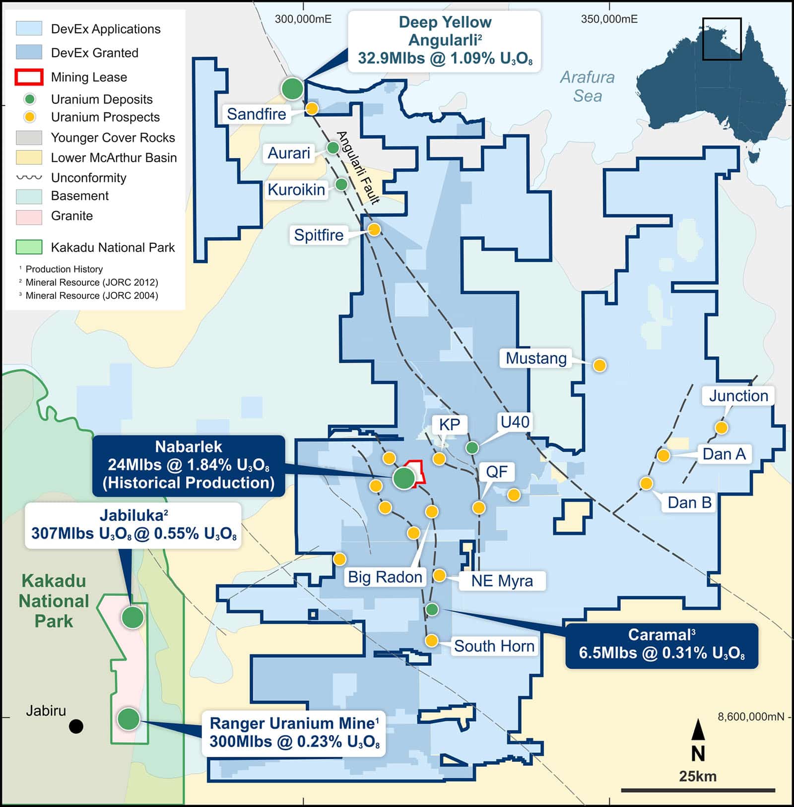 [1] Cautionary Statement (Refer DevEx Announcement, 1 December 2025 – DevEx to Acquire Alligator Energy’s Tenure, Alligator Rivers Uranium Province, NT): The Caramal Inferred MRE presented here was previously reported by AGE under the JORC Code 2004 to ASX on 19 April 2012, in an announcement titled “Alligator announces Caramal resource of 6.5Mlb U3O8 @ 0.31%”. It is acknowledged that: